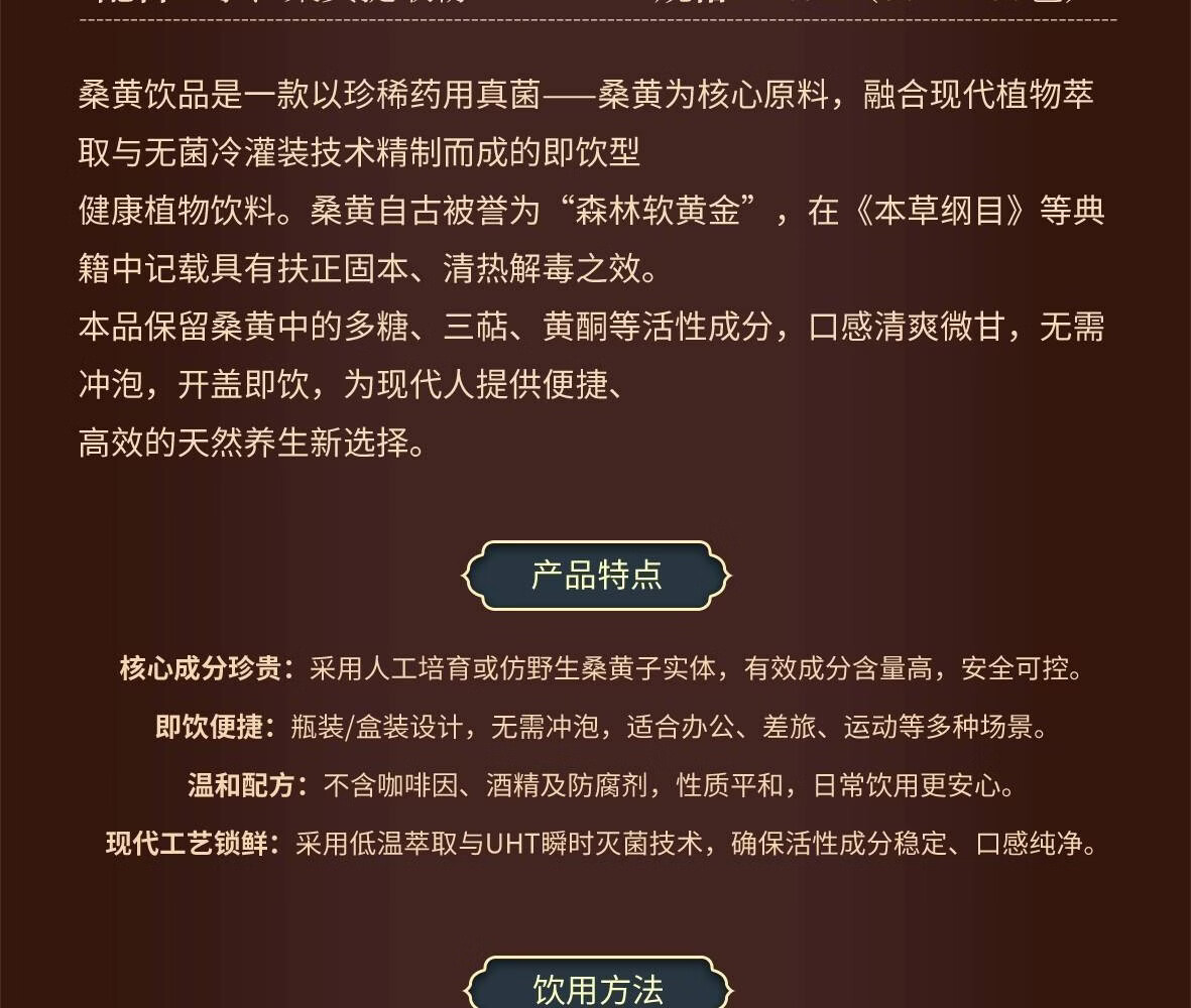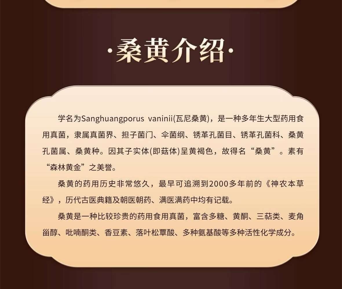 桑黄茶精选优质桑黄子实体 ,采用现代工艺精制而成 ,最大 程度保留其天然活性成分 ,为您带来一杯醇香四溢、养生保健的天然佳饮。
